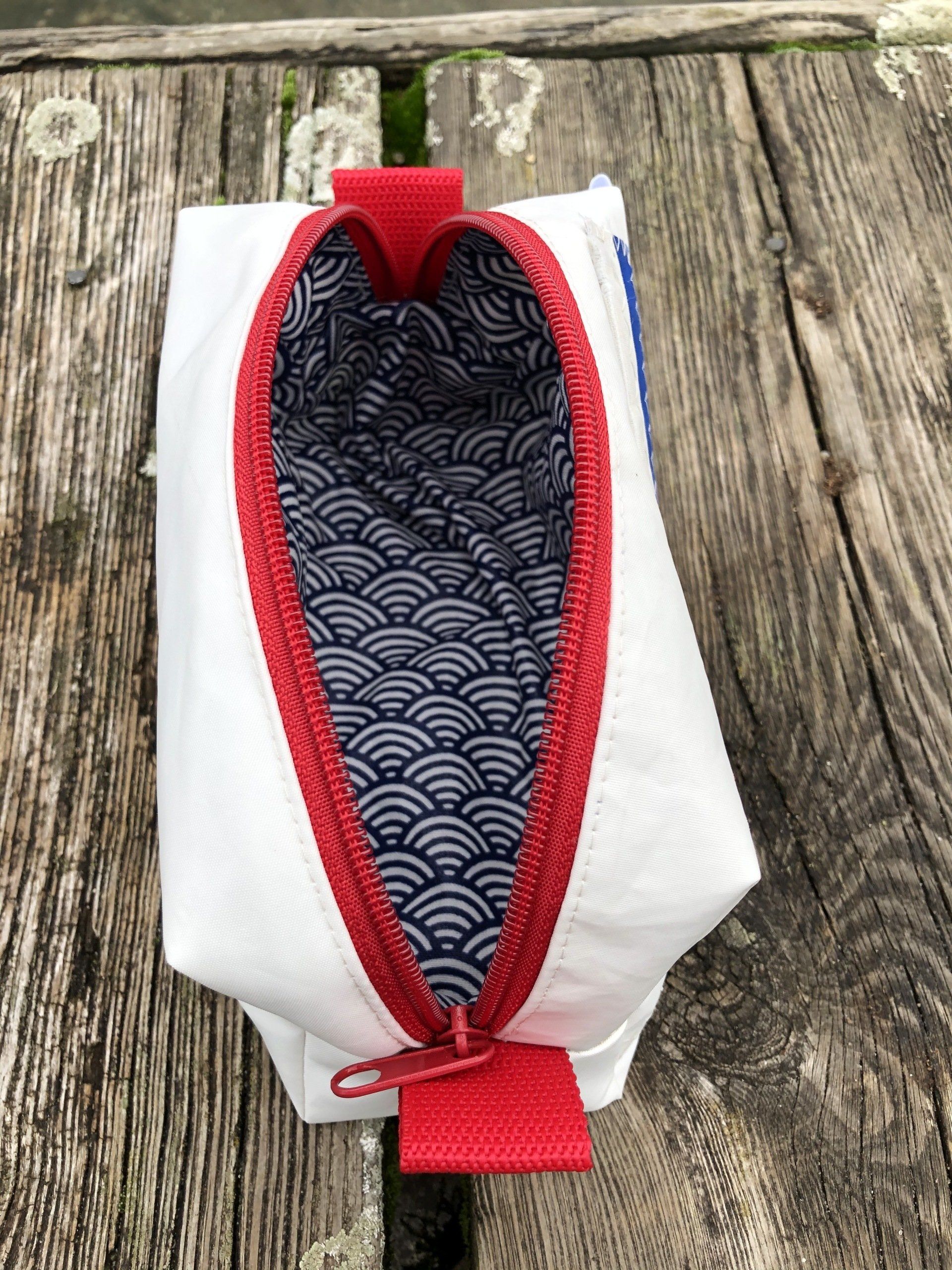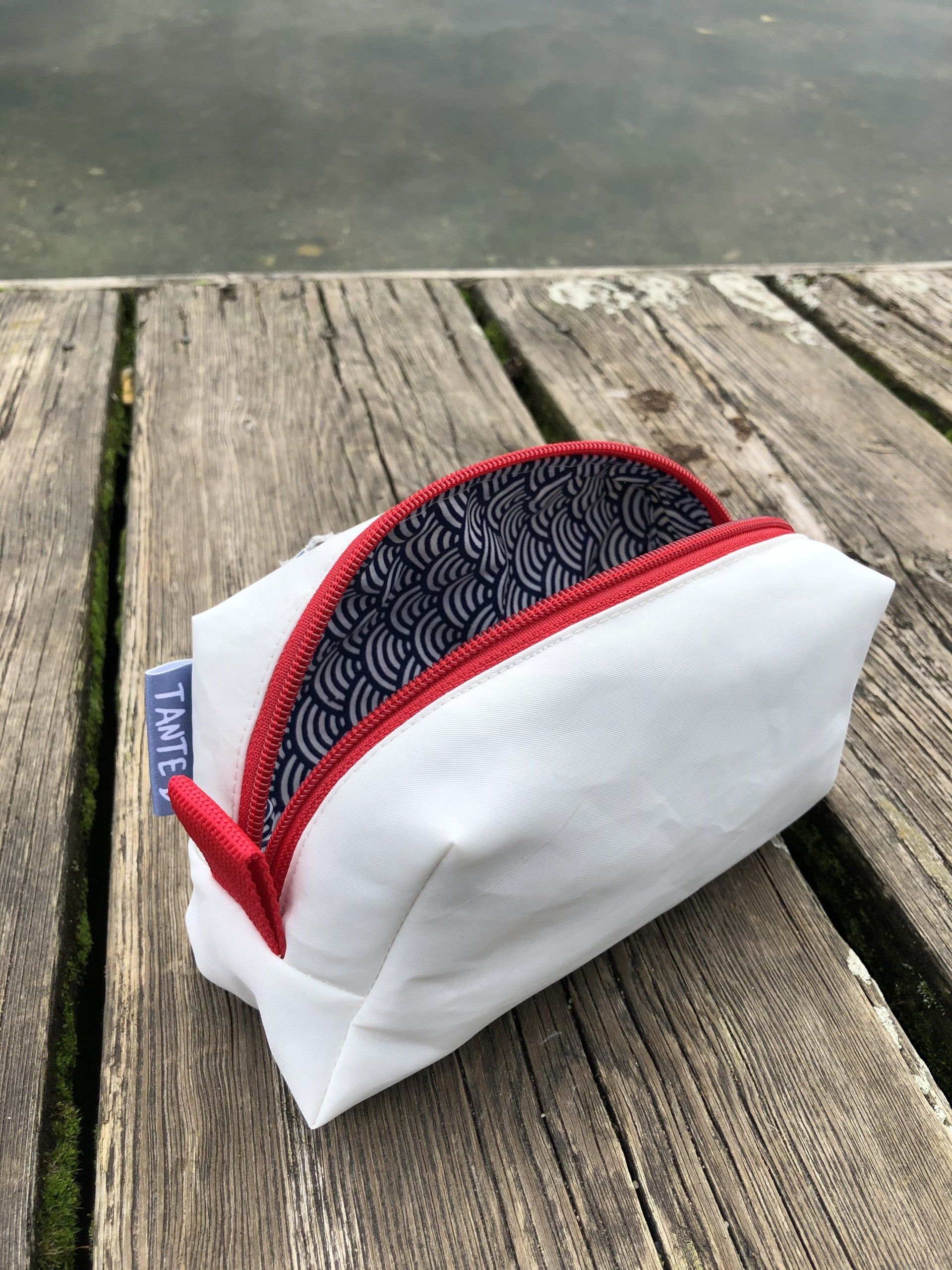 Der Segelstoff selbst ist wasserabweisend,genauso das Innenfutter,das aus beschichtetem Baumwollstoff besteht. Verstärkt wurde die Tasche mit Volumenvlies.